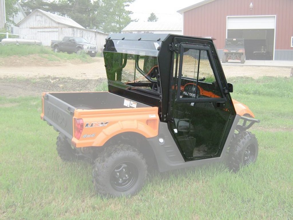 Vyhřívaná kabina pro Kymco UXV 450i, přední okno z bezpečnostního skla se stěračem a ostřikovačem, uzamykatelné 180° otevíratelné dveře z bezpečnostního skla (posuvná okna) a čirého tvrzeného polykarbonátu, zadní panel z čirého tvrzeného UV odolného polykarbonátu, teplovodní topení