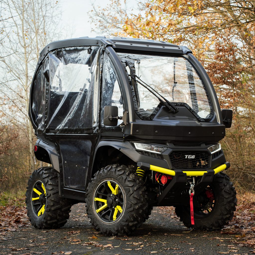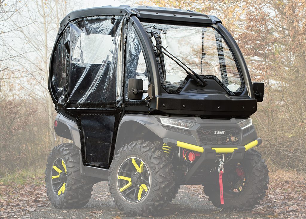 Kompletní kabina pro čtyřkolku TGB blade 600 / 1000, vyhřívané čelní sklo se stěračem a ostřikovačem, na magnety lehce uzavíratelné plachtové dveře. Chrání jezdce před povětrnostními vlivy a znečištěním