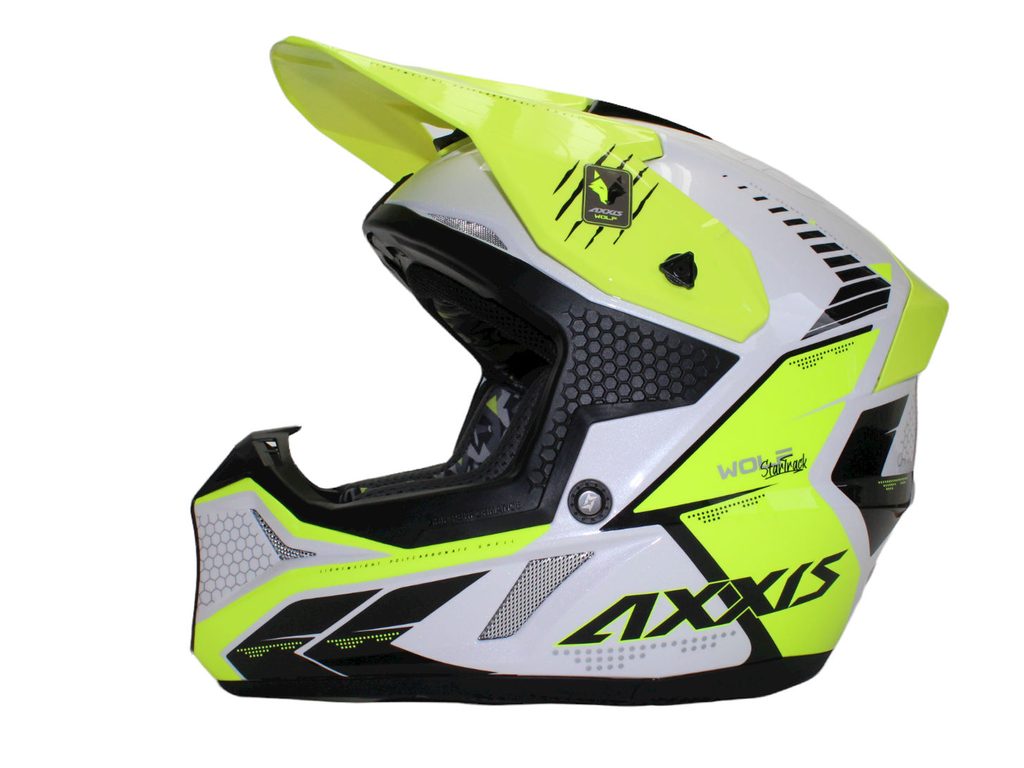 Přilba AXXIS WOLF vyniká atraktivním designem, robustní konstrukcí a je zaměřena na maximální ochranu a pohodlí motokrosového jezdce. Skořepina je vyrobena z ABS ve dvou velikostech. Díky tomu je možné zachovat u menších velikostí nižší hmotnost. WOLF váží ve velikostech XS-M pouhých 1400 ± 50 g a ve velikostech L-2XL 1500 ± 50 g.