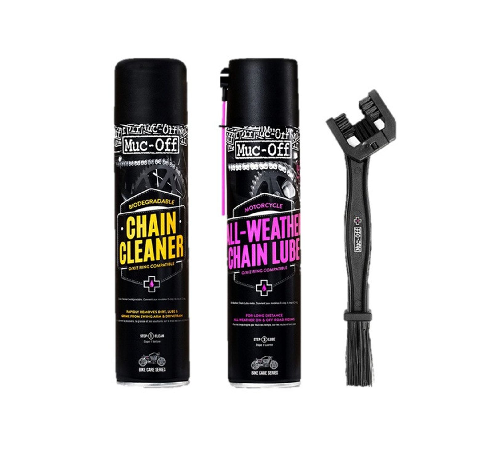 Muc-Off „Biodegradabilní čistič motocyklových řetězů“ byl speciálně vyvinutý tak, aby rychle odstranil špínu, mazací tuk a těžkou špínu řetězu pomocí pokročilých rozpouštědel. Jeho unikátní složení rozkládá olej a mastnotu a zanechává celý řetěz zářivě čistý a bez nečistot. Vhodné pro standardní řetězy O, X a Z-Ring.
