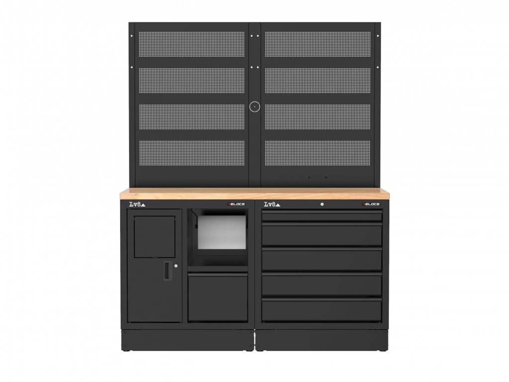 Pracovní stůl délky 1600 mm se servisní skříňkou s odpadkovým košem, přihrádkou na papír a úložnou zásuvkou, a 5 zásuvkovou skříňkou se zámkem. Masivní dřevěná pracovní deska, dvojitý perforovaný panel na nářadí a dvojitá příprava pro elektrickou zásuvku. K dispozici také v provedení s nerezovou nebo melaminovou deskou.