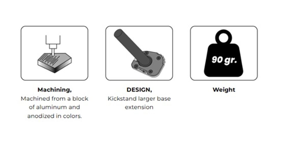Navržena tak, aby zabránila možnému pádu motocyklu během stání. Tento díl, s 100 % širší základnou než originál, umožňuje bezpečně parkovat na měkkém nebo nerovném povrchu. Jedná se o kombinovaný díl, kde jedna část je z nerezové oceli a druhá je soustružená z hliníkového bloku s anodizovanou úpravou. Tyto materiály poskytují vysokou odolnost při zachování nízké hmotnosti (110–160 g v závislosti na modelu).