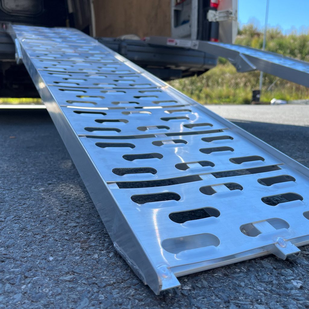 Skládací hliníkové nájezdy, délka 225 cm, šířka 28,5 cm, nosnost 340 kg/nájezd, pogumované konce pro bezpečné uchycení nájezdů, 2 kusy nájezdů, 2 zajišťovací popruhy