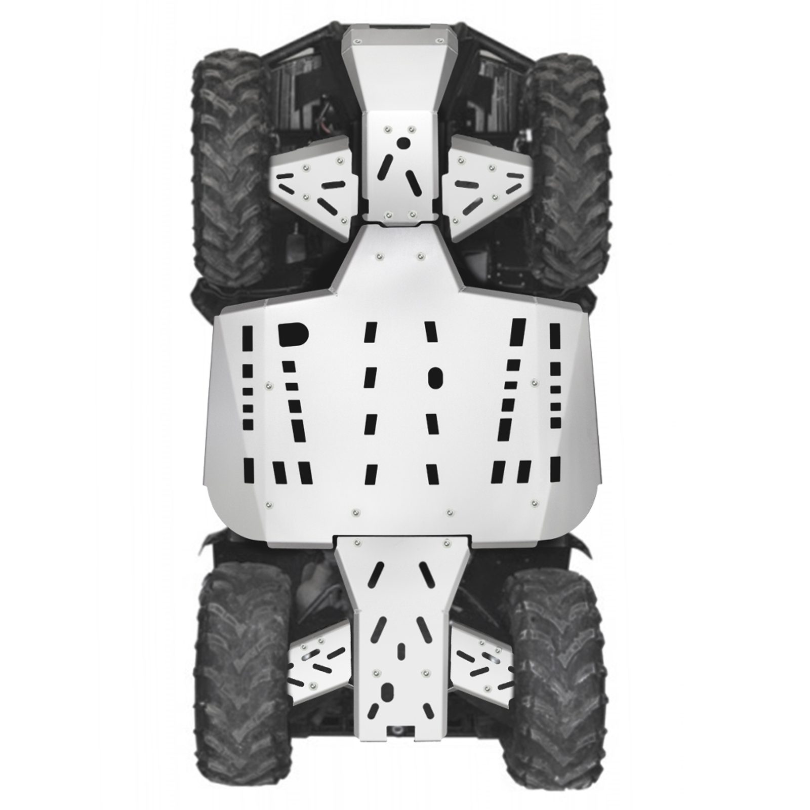 Kompletní kryty podvozku Shark Accessories, dokonalá ochrana spodní části čtyřkolky, z odolného anodizovaného lehkého 4 mm hliníku letecké kvality, montážní otvory pro snadnou údržbu, výřezy pro snadnější čištění čtyřkolky, integrované kryty nášlapů, nízká hmotnost, snadná montáž