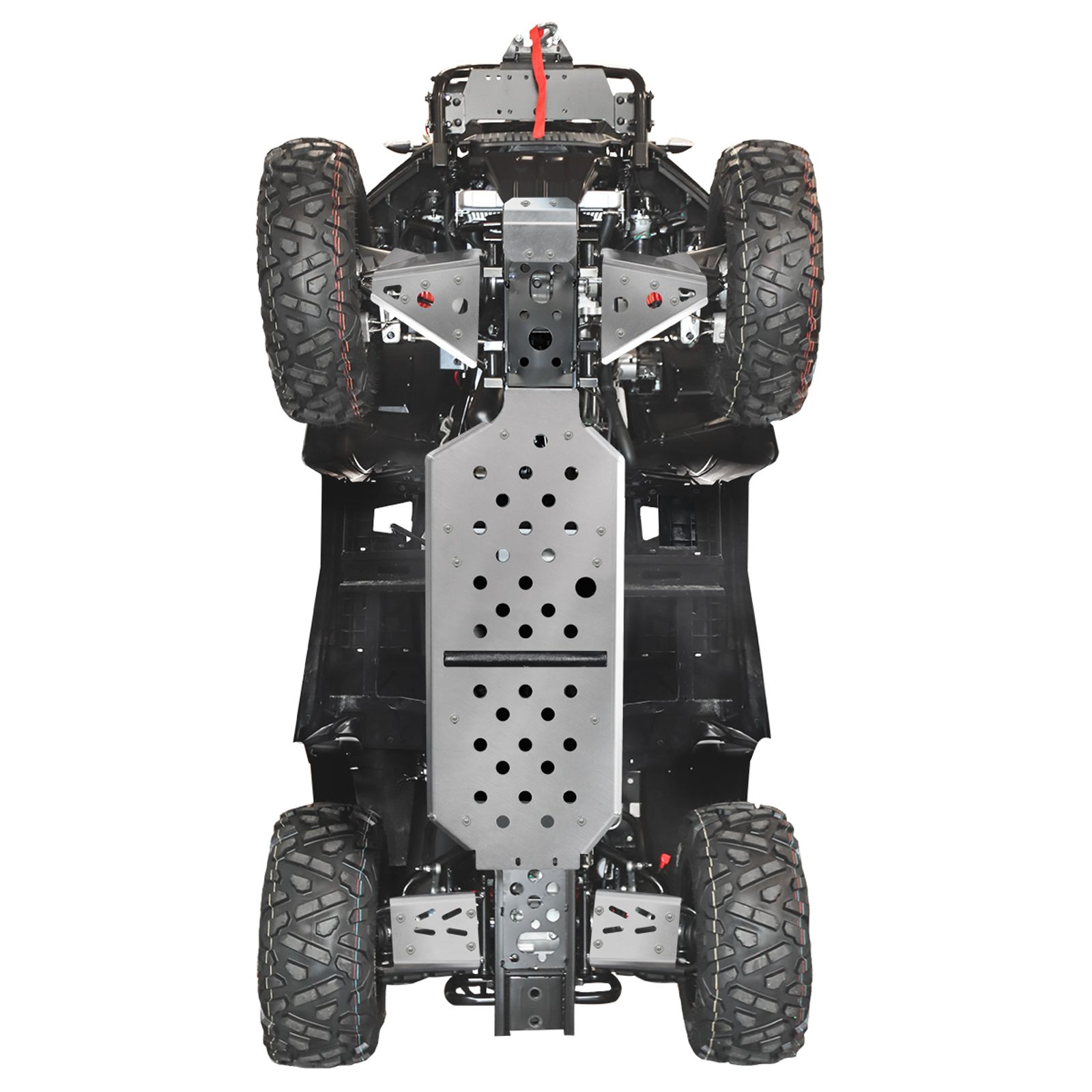 Kompletní kryty podvozku Shark Accessories, ochrana spodní části čtyřkolky, z odolného anodizovaného a lehkého 4 mm hliníku letecké kvality, montážní otvory pro snadnou údržbu, výřezy pro snadnější čištění čtyřkolky, integrované kryty nášlapů, nízká hmotnost, snadná montáž