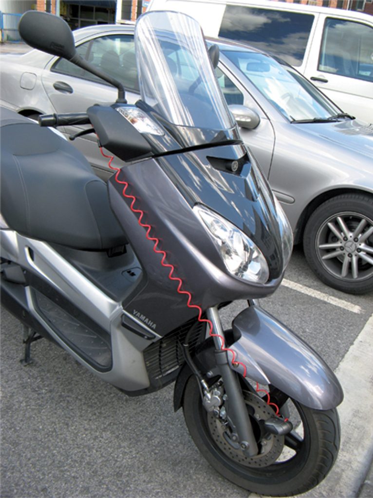 Sada 20 červených káblov. Čo slúži ako varovanie, že zámok na disku je nasadený. Nebude žiadne naštartovanie vodiča a možné zničenie motocykla.